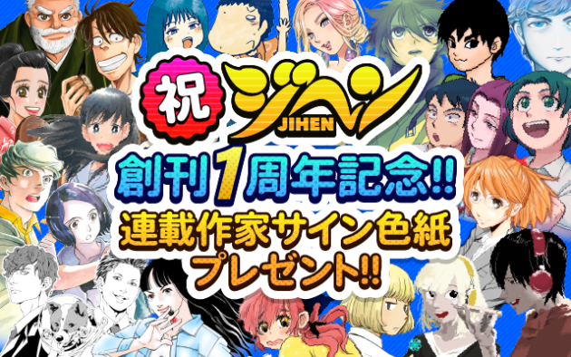 「ジヘン」創刊1周年を記念して、4月6日17:00〜4月30日23:59の期間で、掲載作家のサイン色紙をプレゼントするキャンペーンが実施されています。