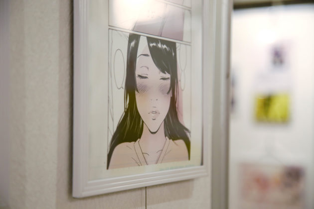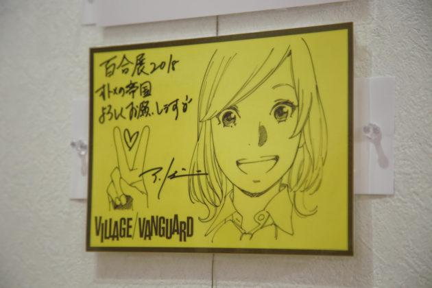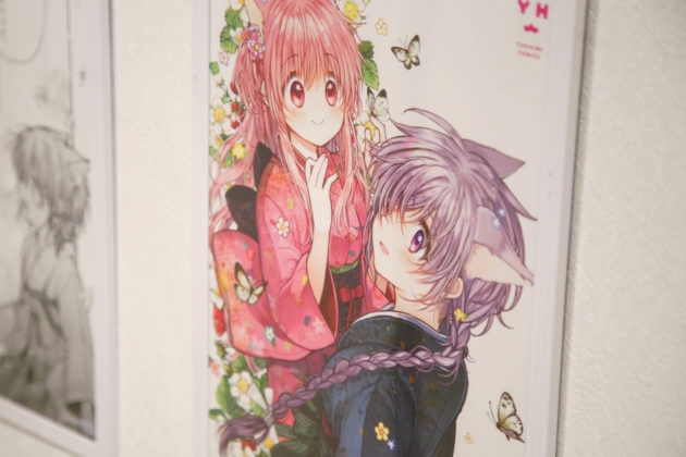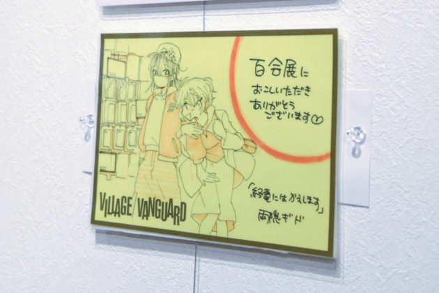 百合界の女神的存在で、その描線もキャラクターデザインも全てが新しいのに不朽の作風で尊い。百合といえば儚く消えるというイメージを生命感溢れる描線で払拭してくれます。今回の展示では『百合展2017』のグッズに用いられたイラストが飾られており、そのデザインセンスにも息を呑むほど。