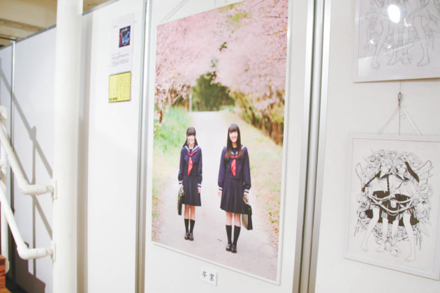 大人気の『citrus』から、迫力あるイラストを展示。気迫の満ちた柚子と芽衣のこちらを見据える瞳には、男女問わず魂を吸い取られそうに。ギャルという設定の柚子ですが、その奔放な姿の内に宿す純真が、芽衣との出会いによって染まっていく姿が凄絶。